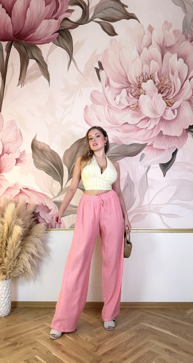 100% bavlněné lehké lososově růžové kalhoty s oranžovými proužky, s elastickým pasem a šňůrkou. Mají volný, vzdušný střih a příjemný materiál, ideální na léto nebo pohodové nošení. Snadno se kombinují s jednoduchými topy i košilemi.
