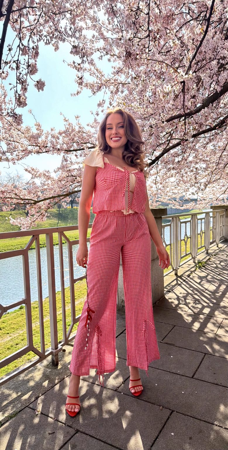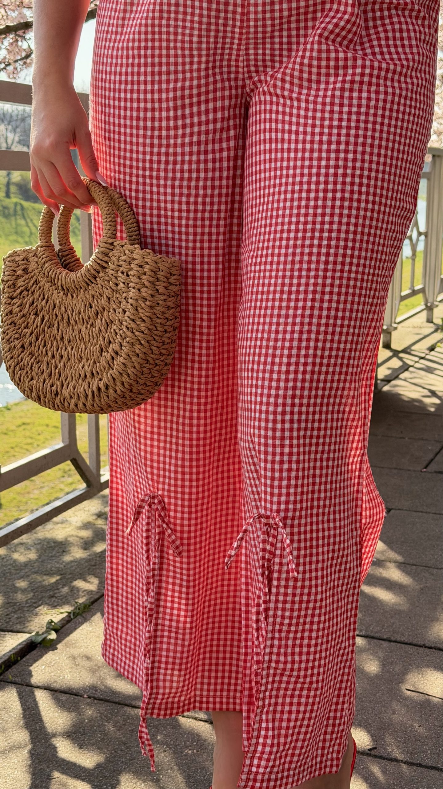 100% příjemný bavlněný roztomilý gingham komplet, který působí svěže a letně, top s mašličkou je fakt cute a dobře drží tvar. Kalhoty mají gumu v pase a mašličky na nohavicích. Materiál je lehký a příjemný, ideální na teplé dny.