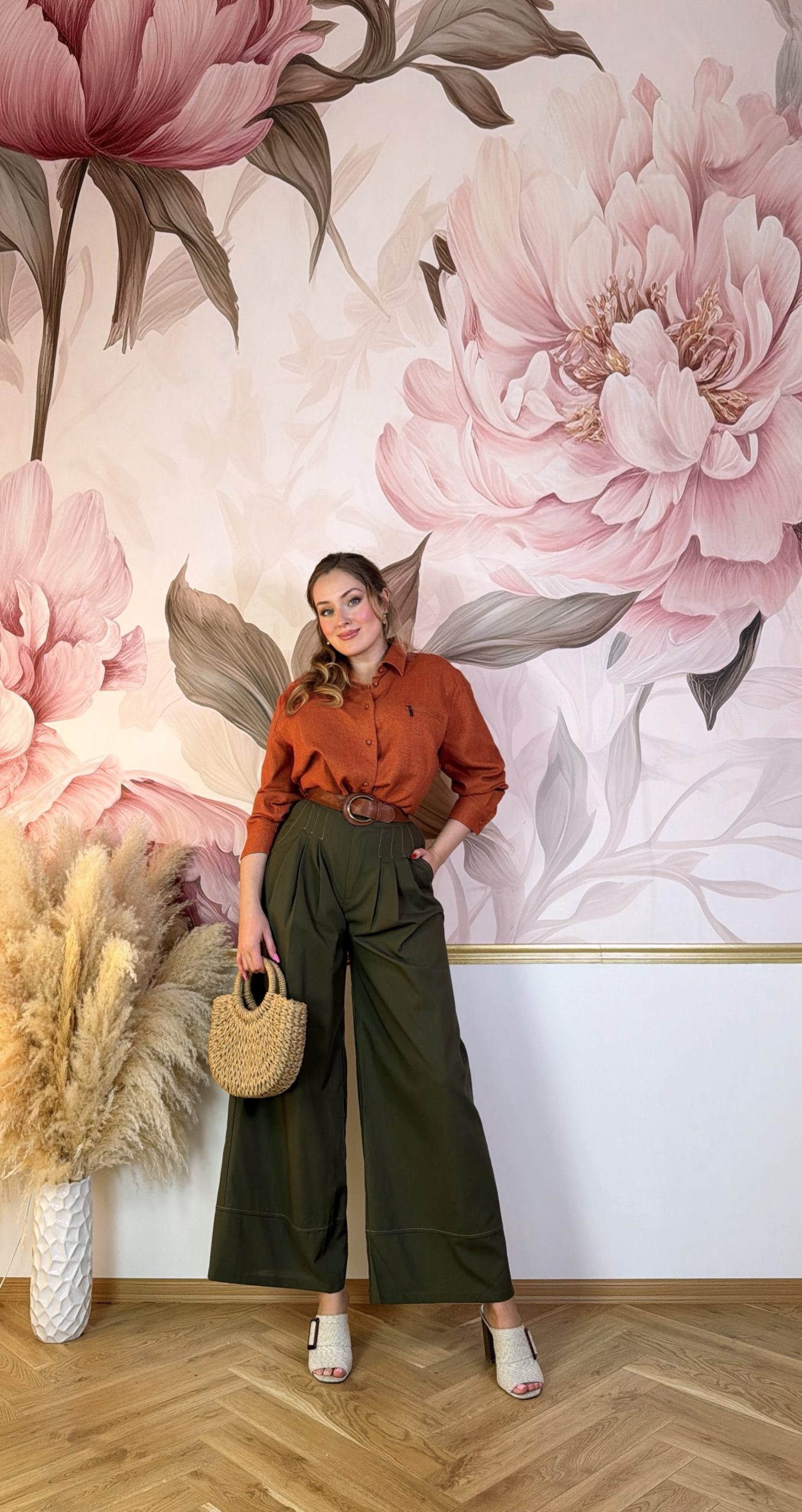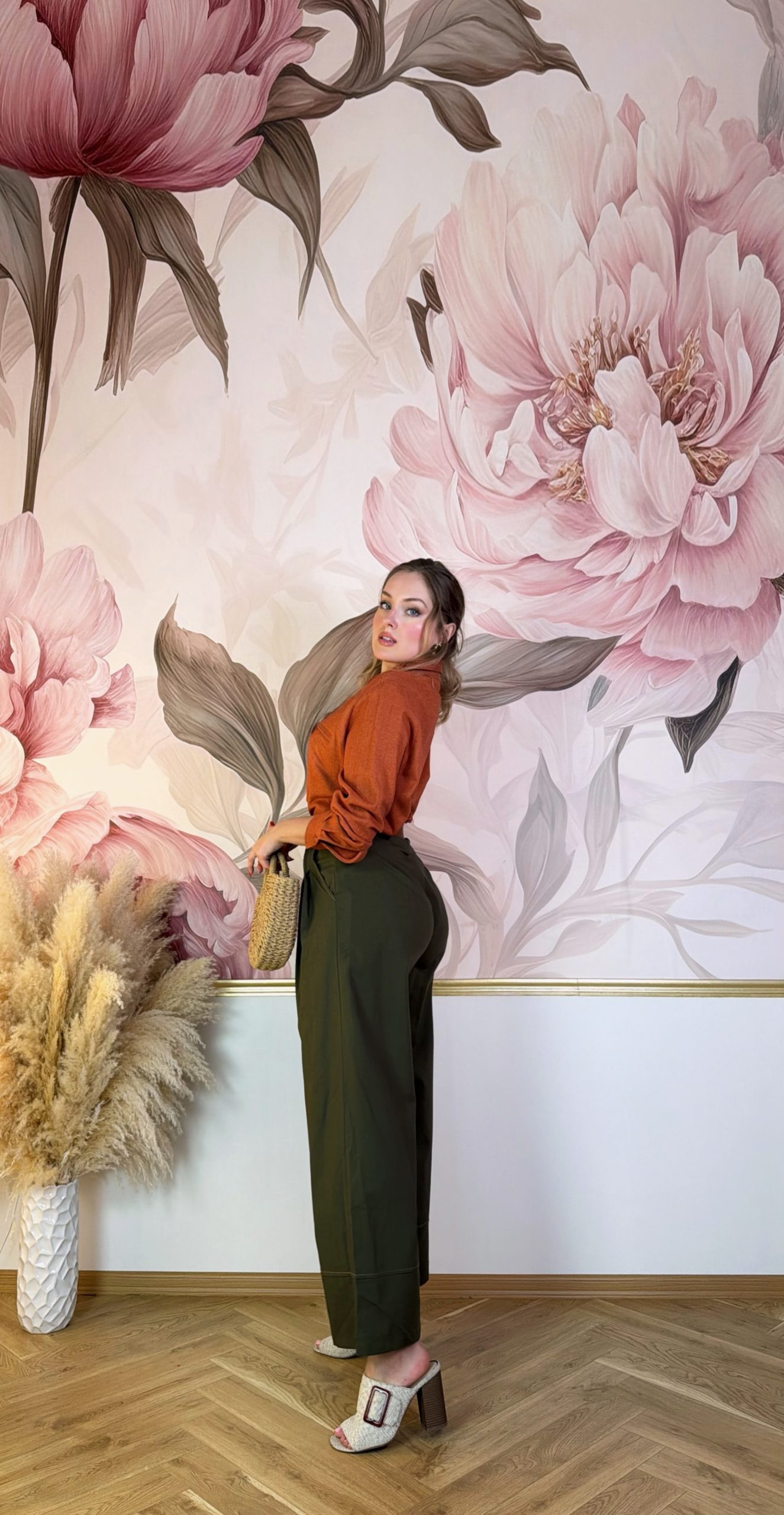 35% viskózové, stylové khaki kalhoty s vysokým pasem, kapsami a sklady. Mají volnější, elegantní střih a pevnější materiál, díky kterému drží hezky tvar. Skvělé do práce i na běžné nošení – snadno sladitelné s košilí i basic topem.