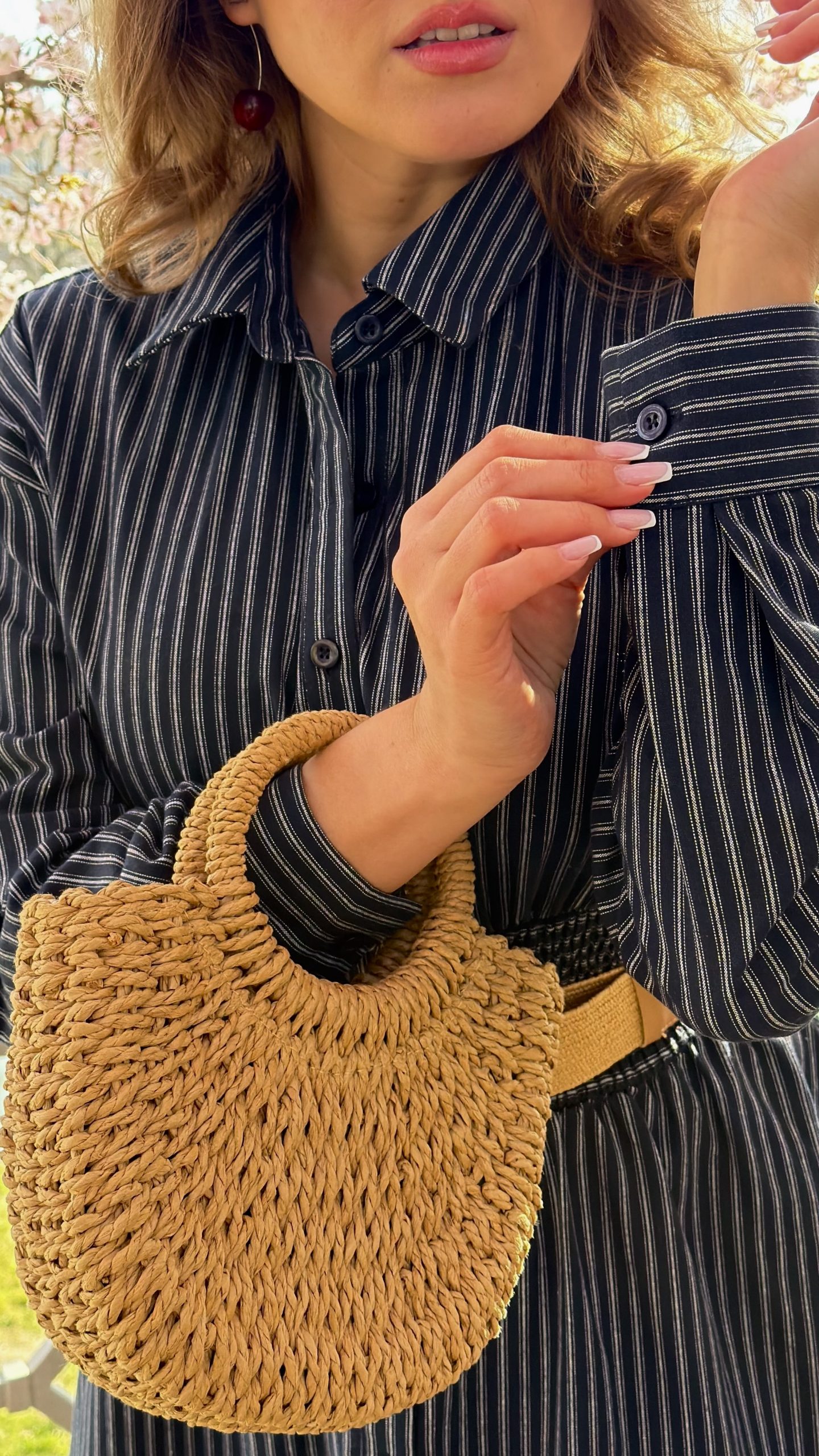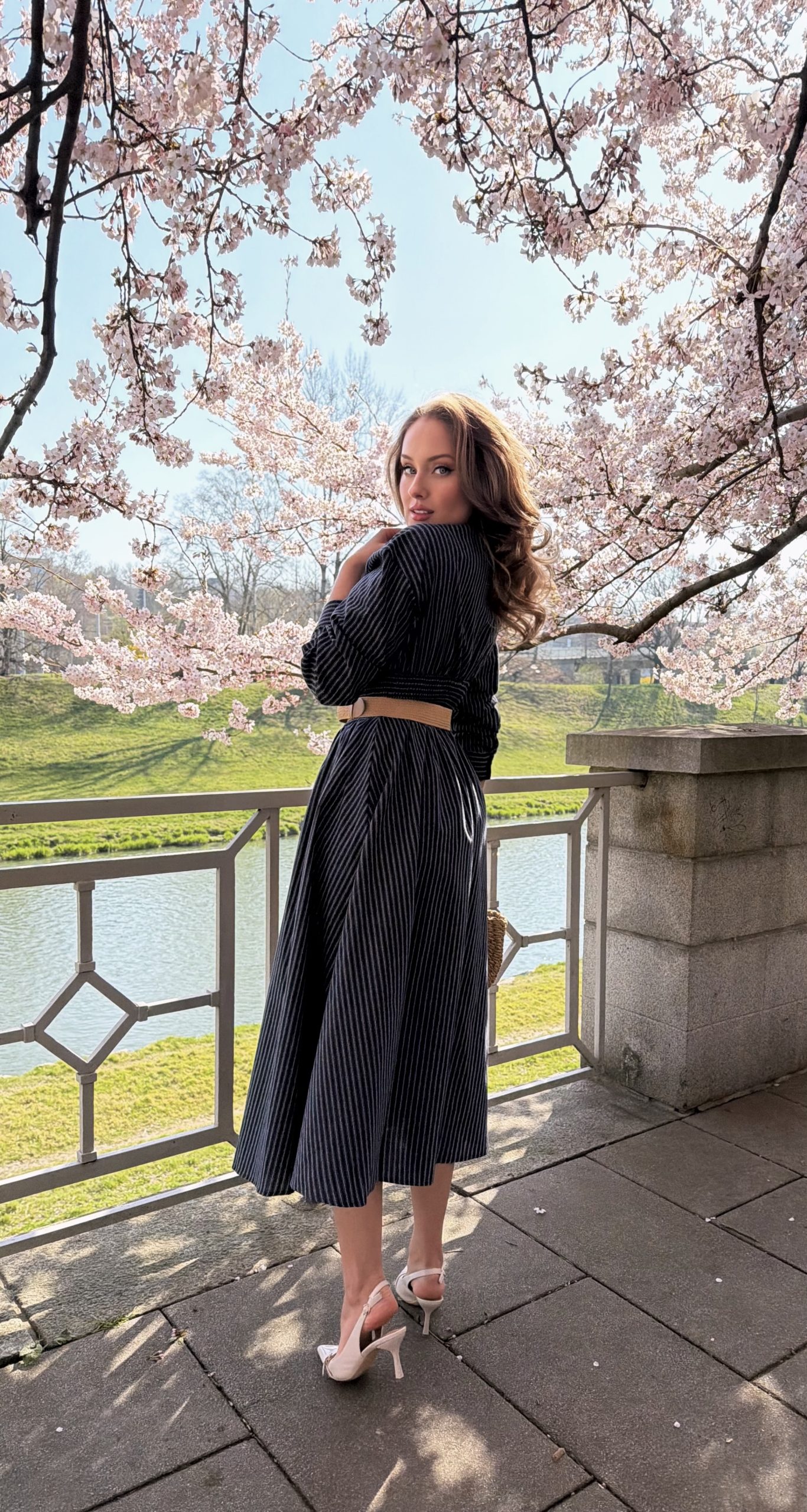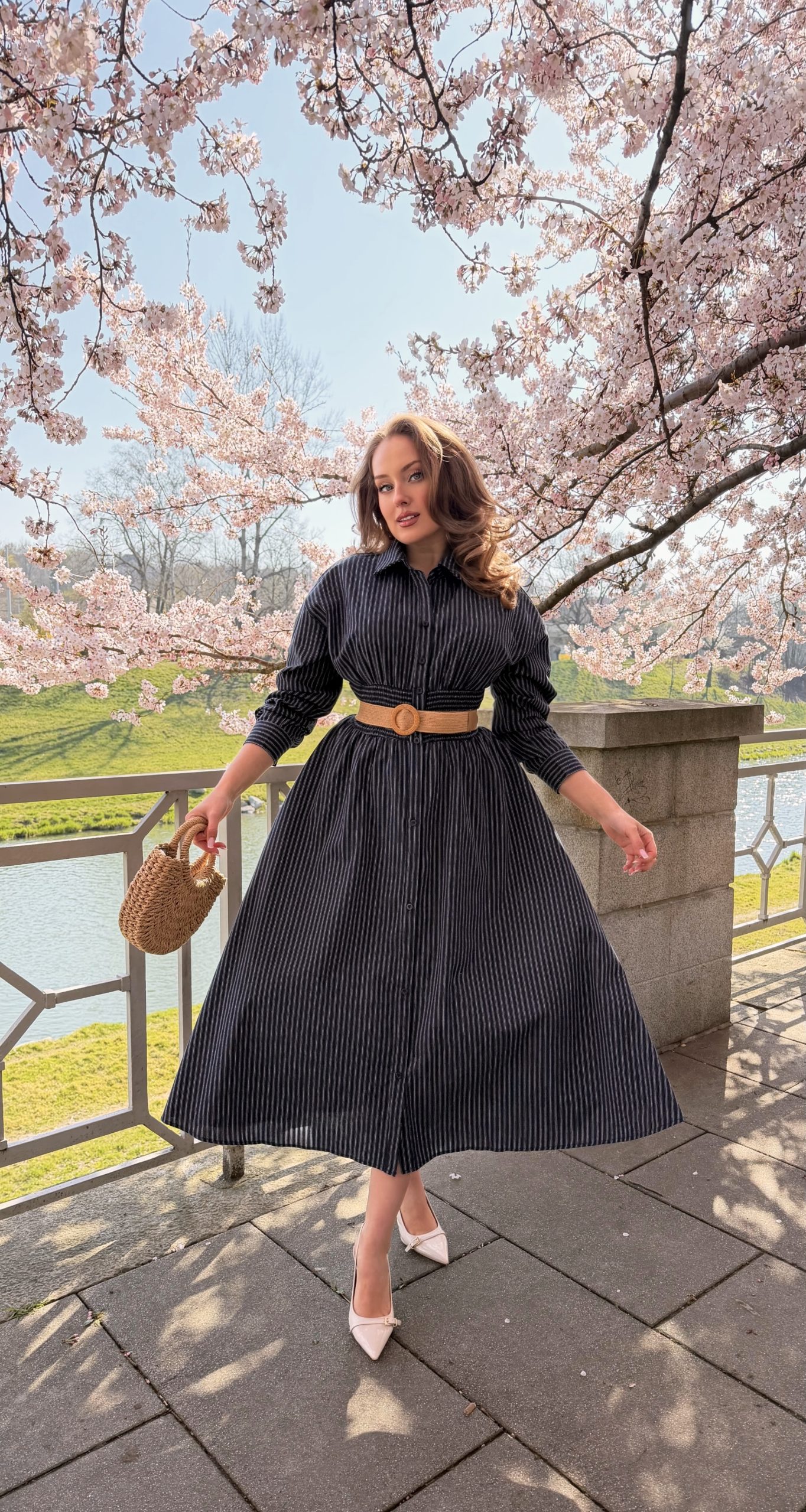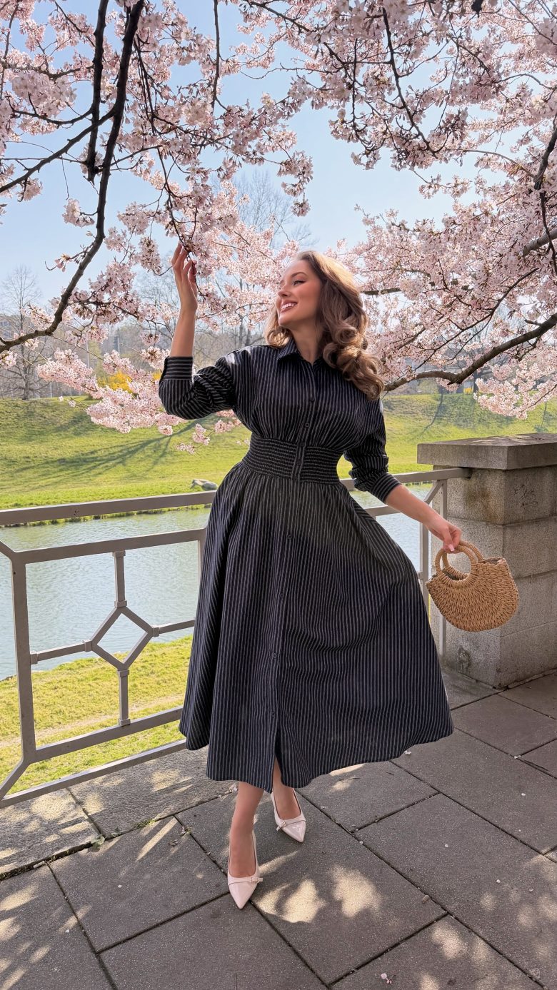 45% kvalitní bavlněné košilové šaty s proužkem a staženým pasem, kapsami, gumou v pase pro lepší přizpůsobení postavě a zapínáním na knoflíčky, působí hodně chic a lehce business, ale pořád nositelné jako denní outfit.