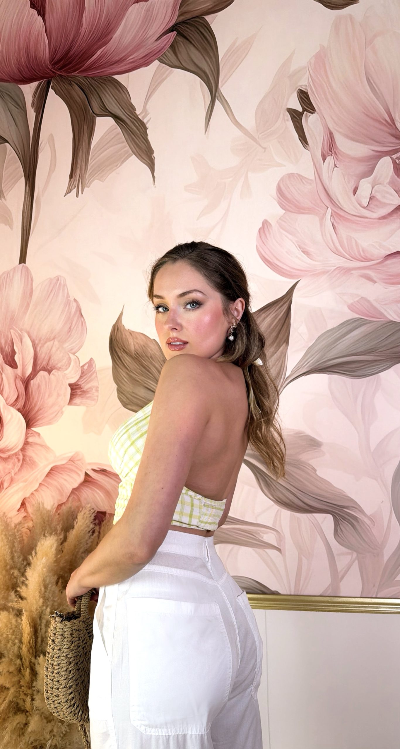 57% bavlněný letní kostkovaný top v žluto-bílé kombinaci s hlubším výstřihem a zavazováním. Má jemně nařasené detaily, které hezky tvarují postavu, a lehký materiál ideální do teplých dnů. Skvělý k džínům, šortkám i sukni.