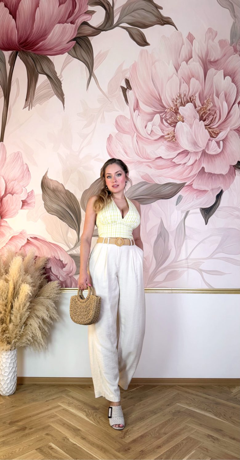 89% kvalitní viskózové, elegantní béžové kalhoty s vysokým pasem, kapsami a sklady vpředu, které krásně tvarují postavu. Mají volnější, lehce zúžený střih a příjemný materiál – ideální do práce i na stylový každodenní outfit.