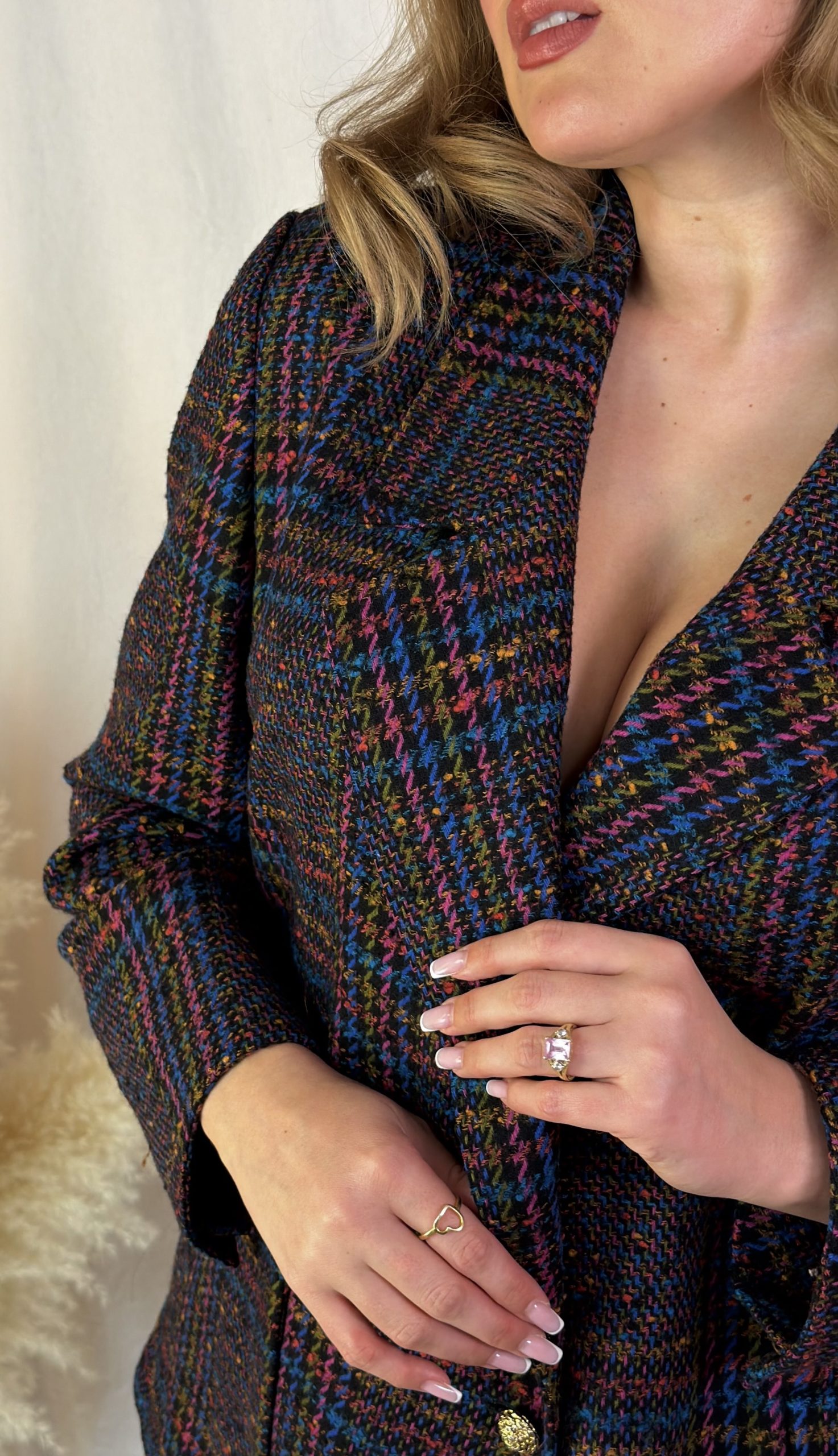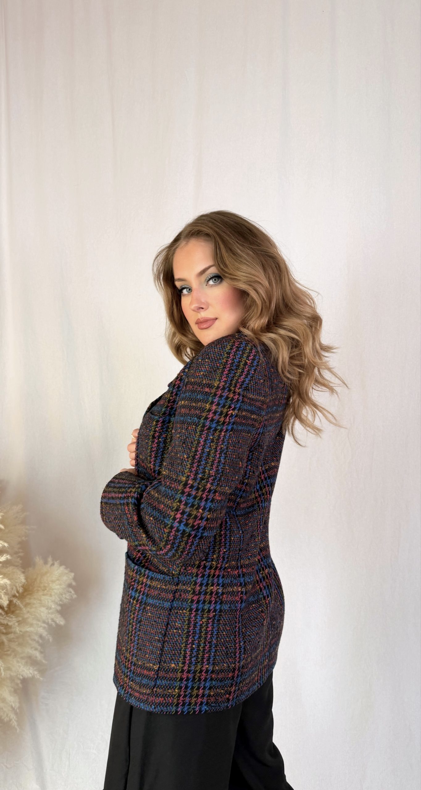 Barevné kostkované vintage podšité sako z 92% vlny se zpevněnými rameny a zlatými