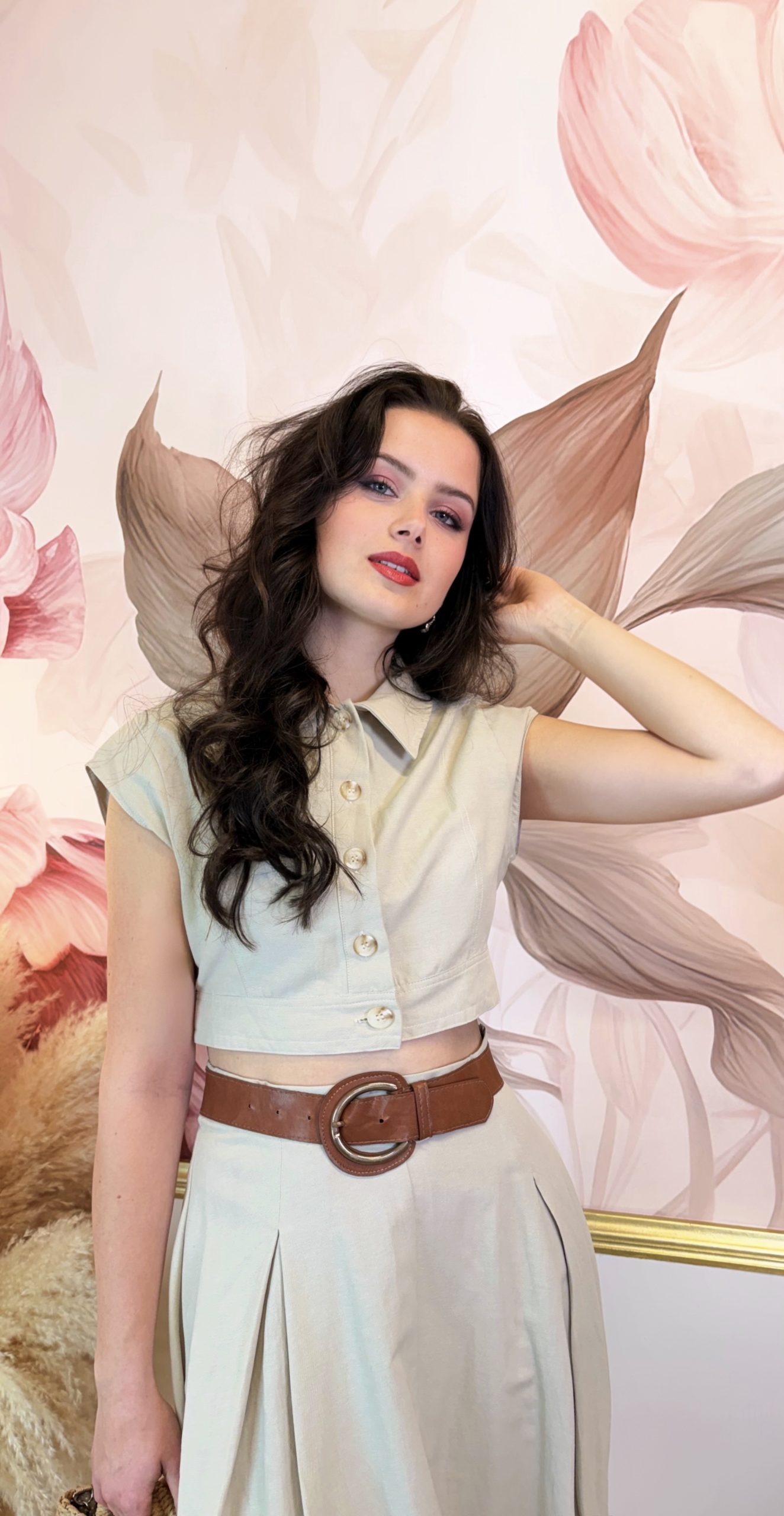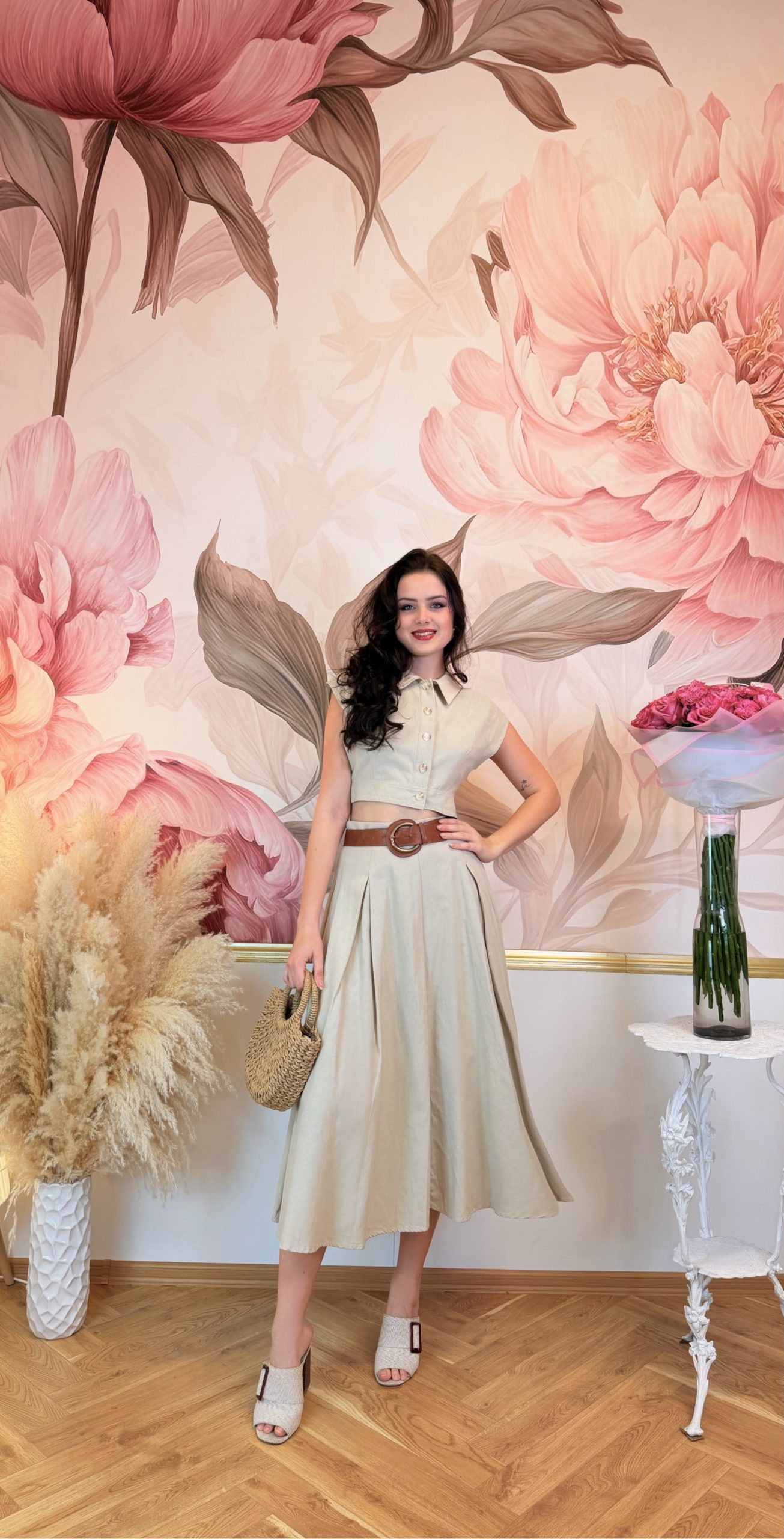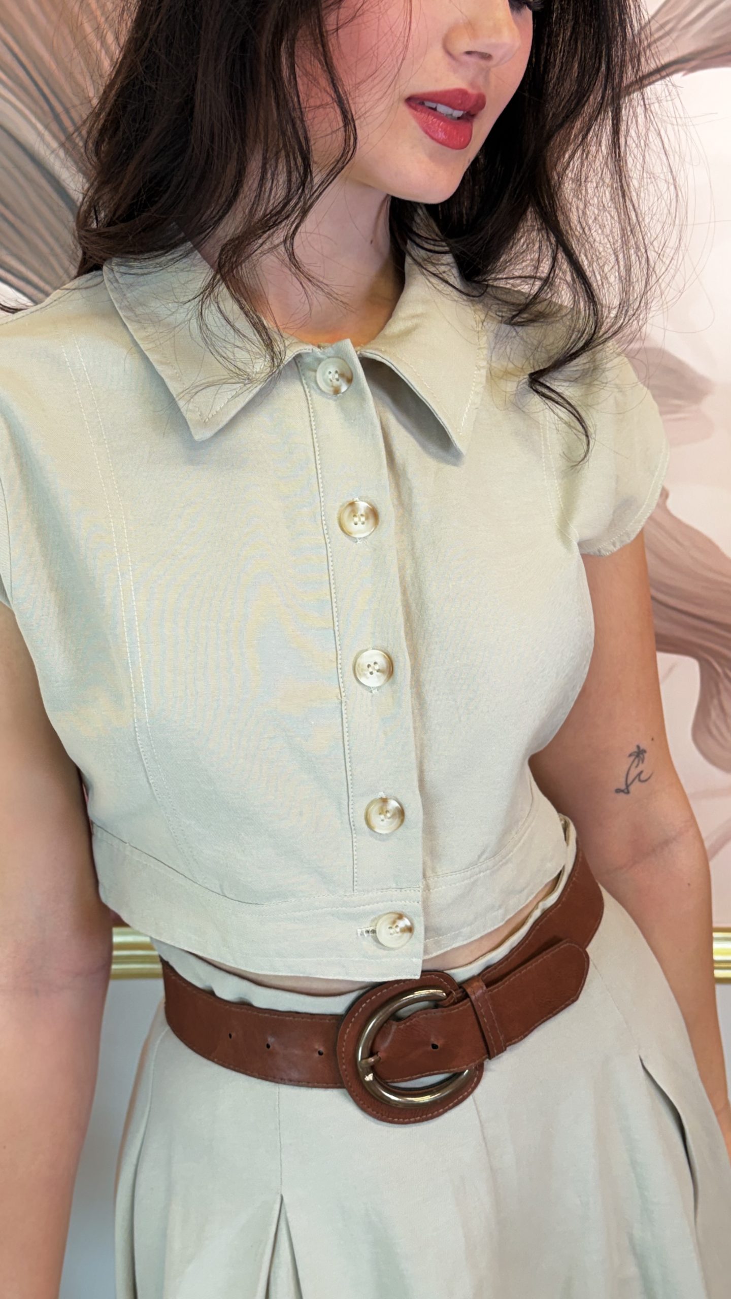 Béžový bavlněný kvalitní komplet tvořený krátkým košilovým topem s límečkem a výraznými knoflíky a splývavou sukní ve stejném odstínu. Horní díl působí strukturovaně a drží tvar, sukně je lehká a vzdušná a v pase má gumu, takže se přizpůsobí postavě. Elegantní a nadčasový set na jarní i letní dny.