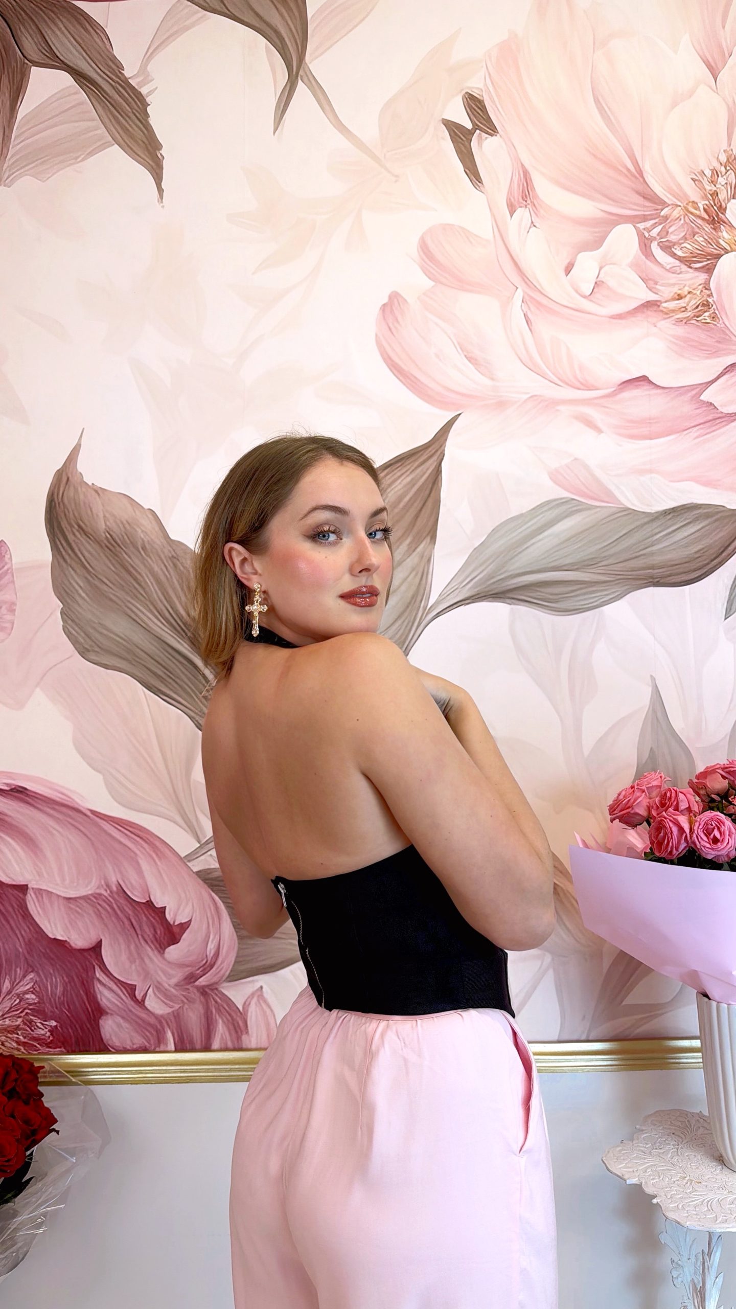 Černý korzetový halter top z bandážového materiálu, který tvaruje postavu a hezky drží prsa. Má zapínání na zip na zádech.