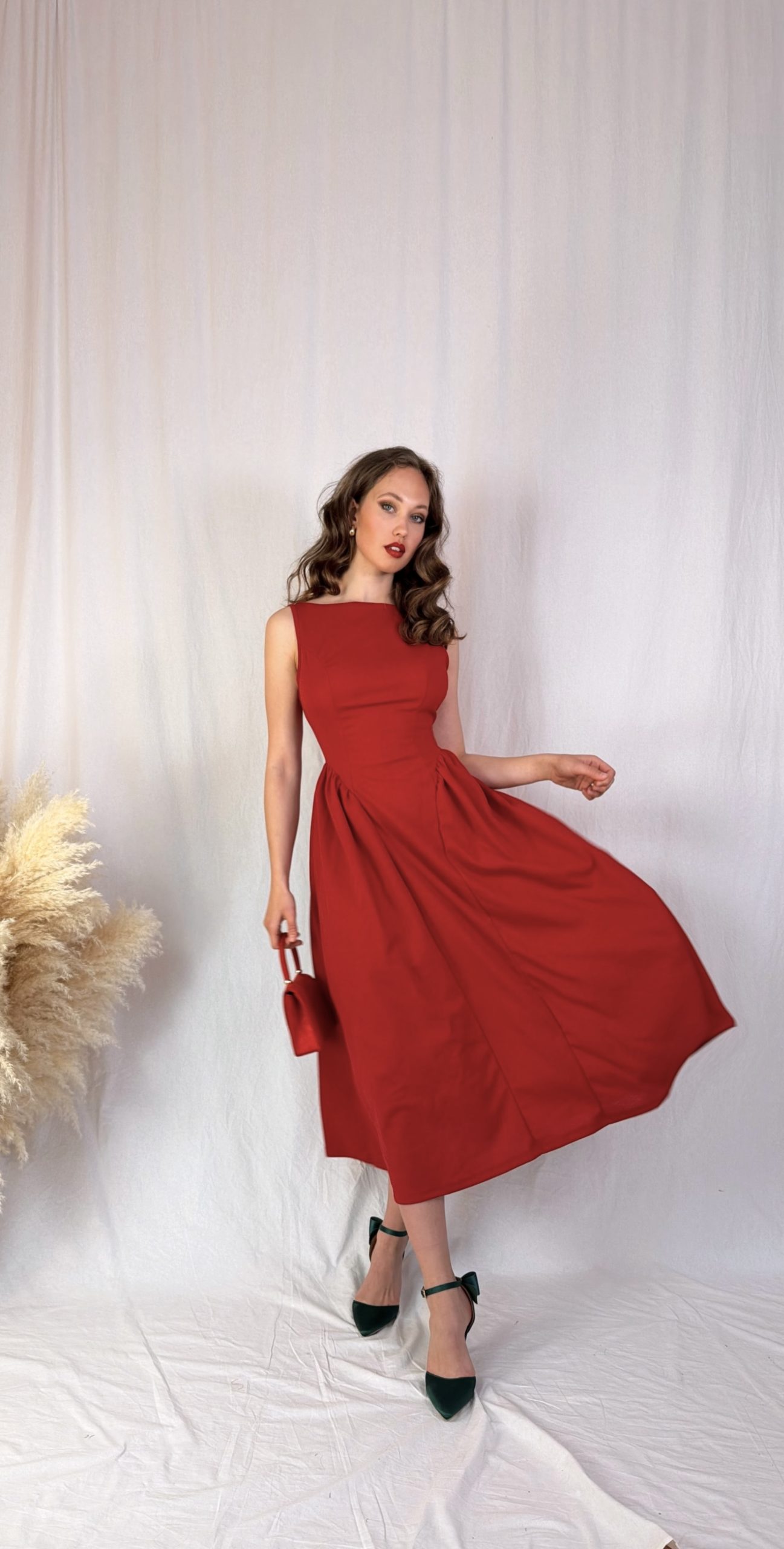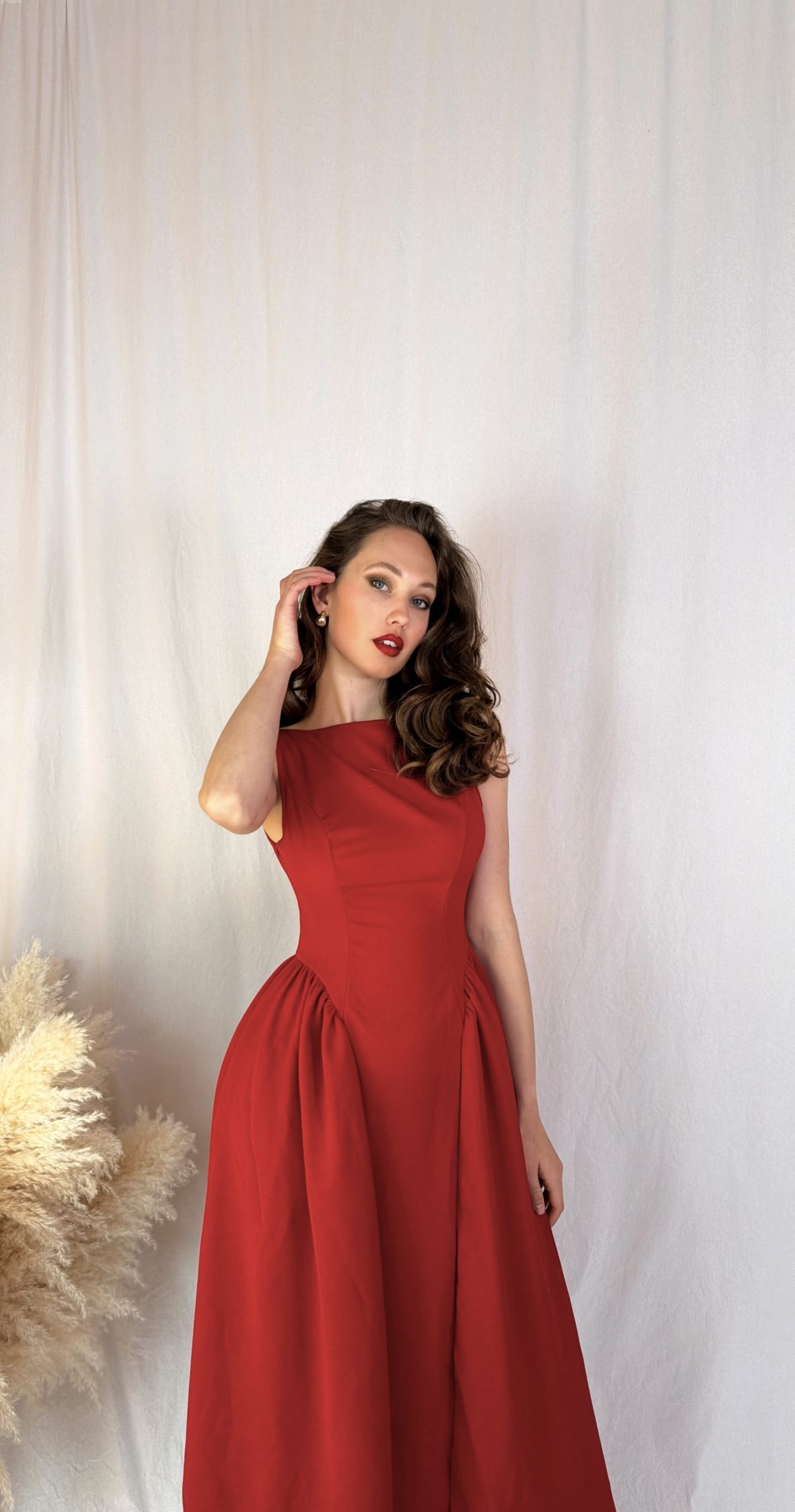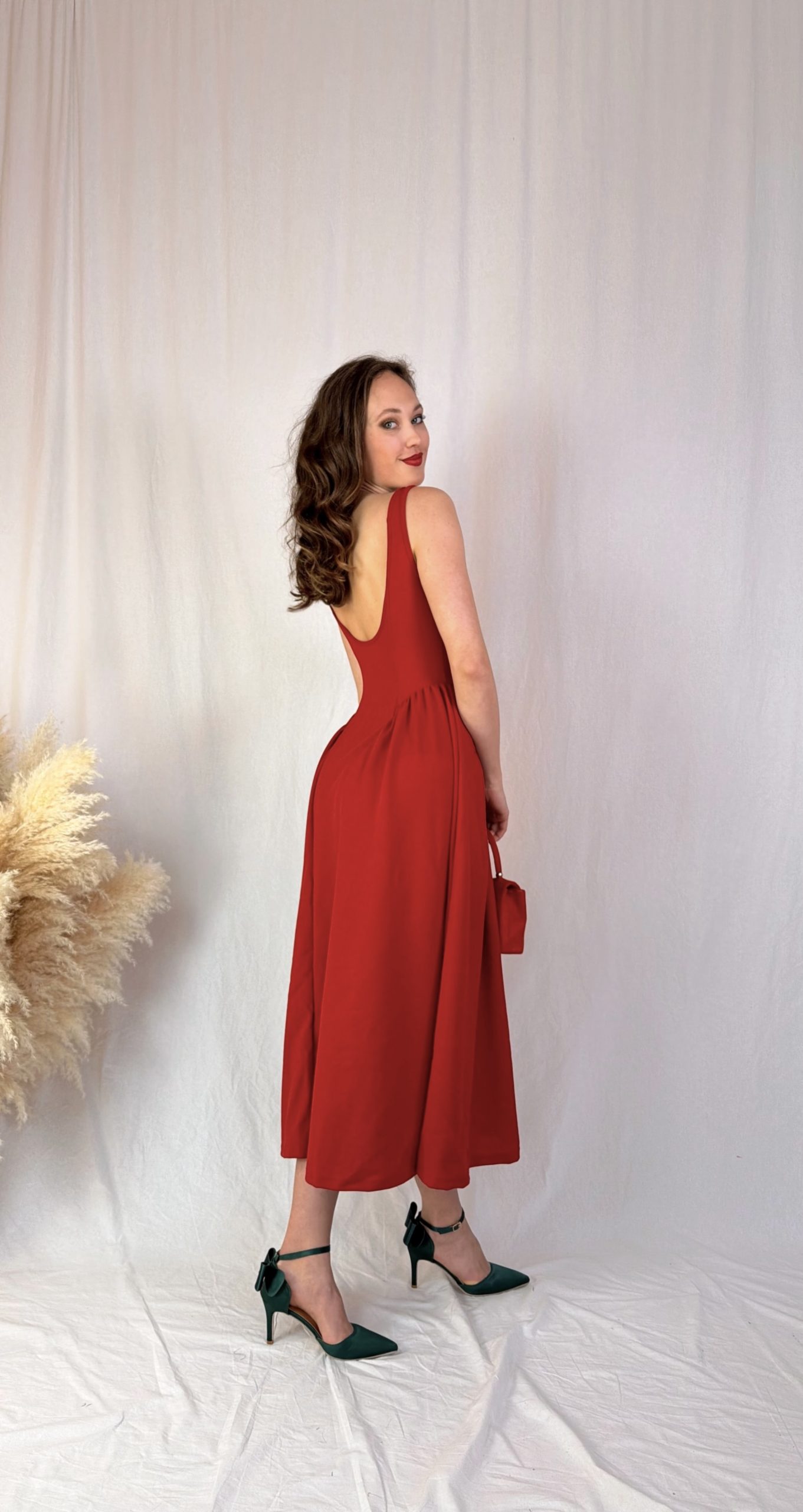 Červené šaty na ramínka s jemně řaseným pasem a odhalenými zády
