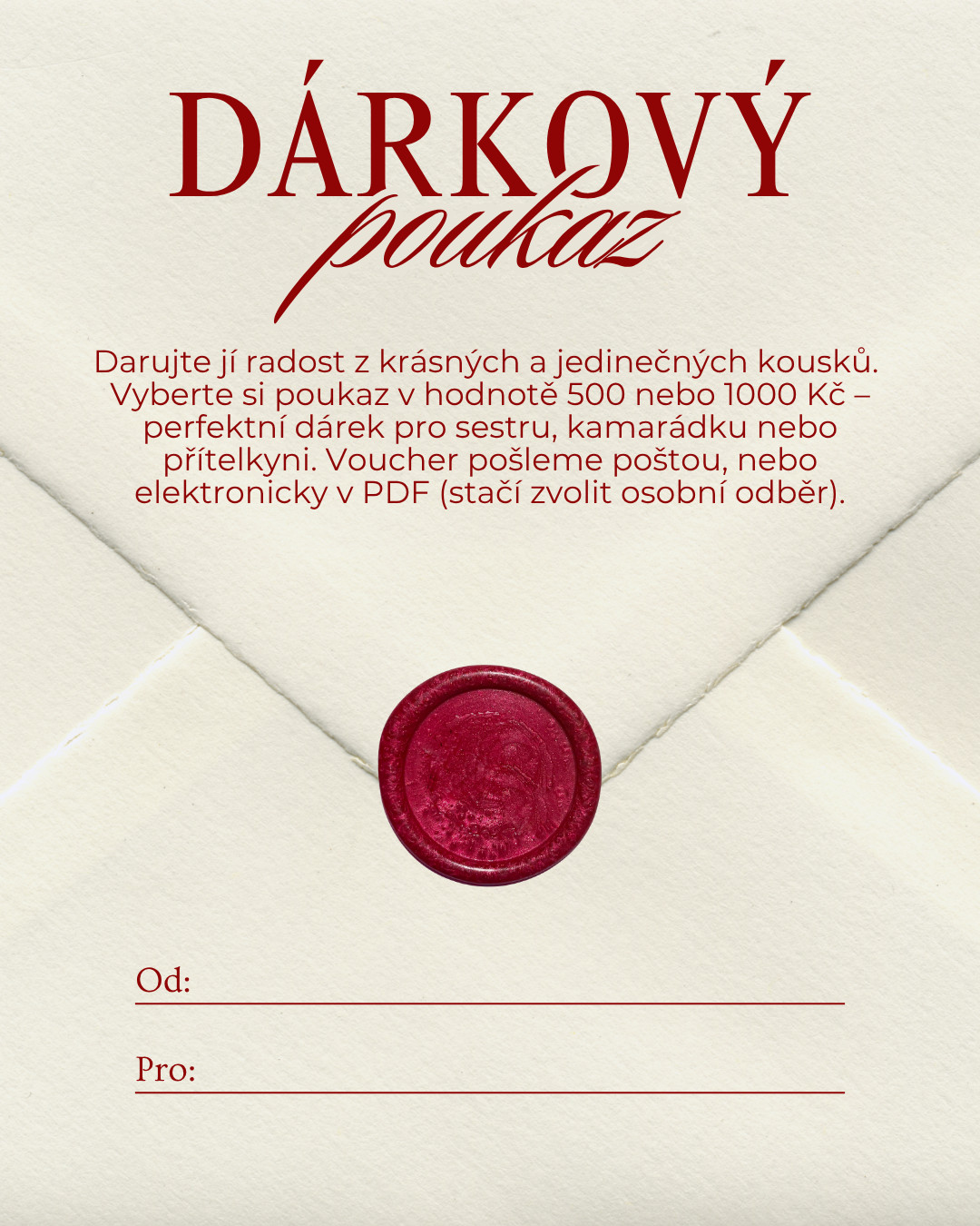 Vyberte si poukaz v hodnotě 500 nebo 1000 Kč – perfektní dárek pro sestru, kamarádku nebo přítelkyni. Voucher pošleme poštou, nebo elektronicky v PDF (stačí zvolit osobní odběr).