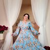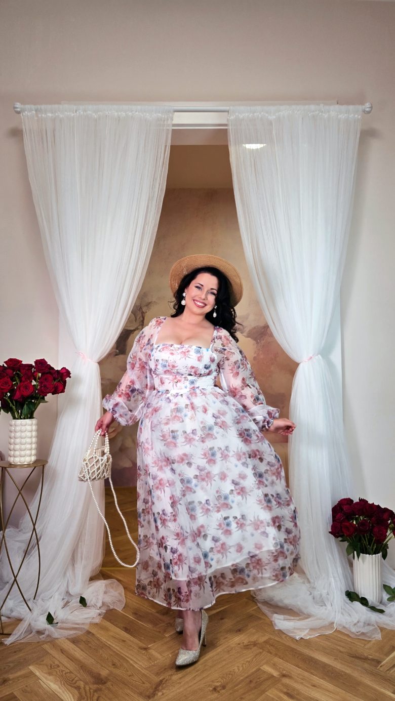 Jemné šifonové maxi šaty v pastelových tónech s ozdobnými knoflíčky, jemným květinovým vzorem a balonovými rukávy vypadají jako z romantického filmu. Skvěle se hodí na slavnostní příležitosti. Mají spodničku, vzadu skrytý zip a zavazování na mašli.