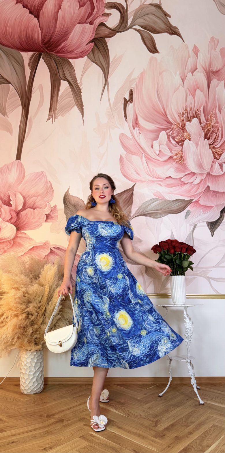 Originální modré šaty s výrazným uměleckým vzorem v podobě Hvězdné noci