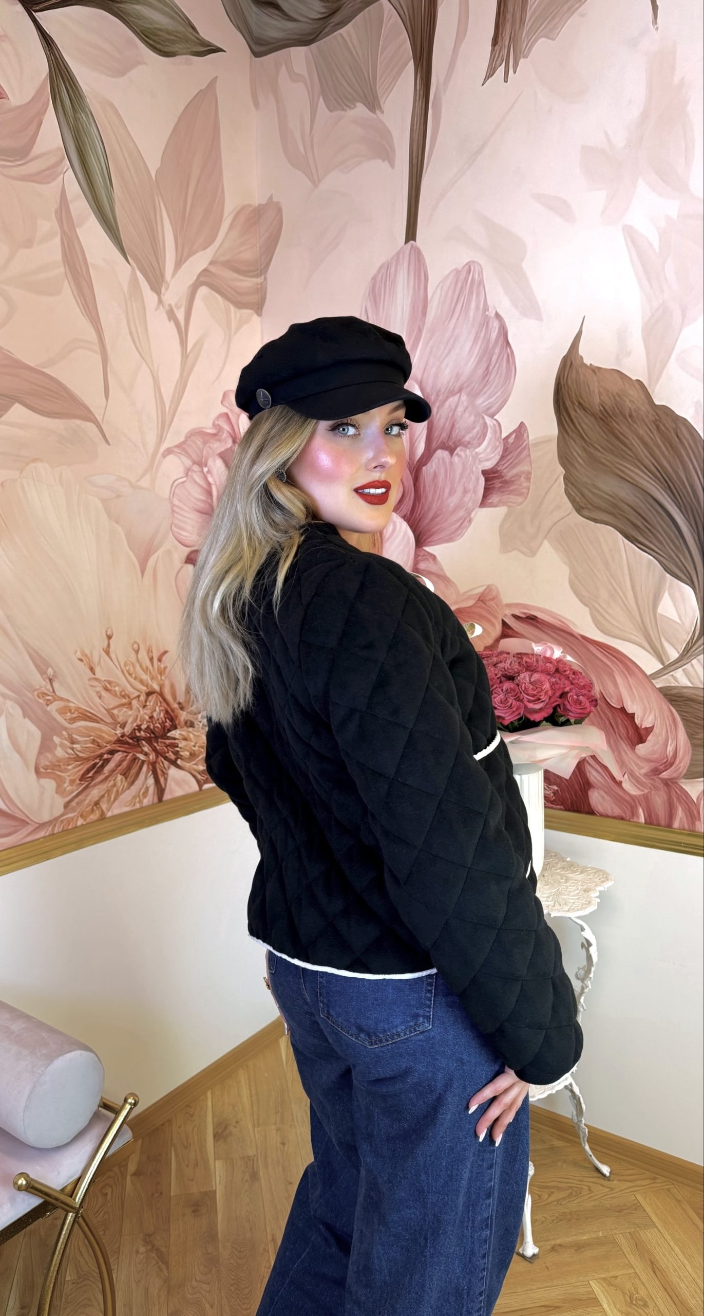 Prošívaná elegantní černá bunda s kontrastními lemy a vázáním