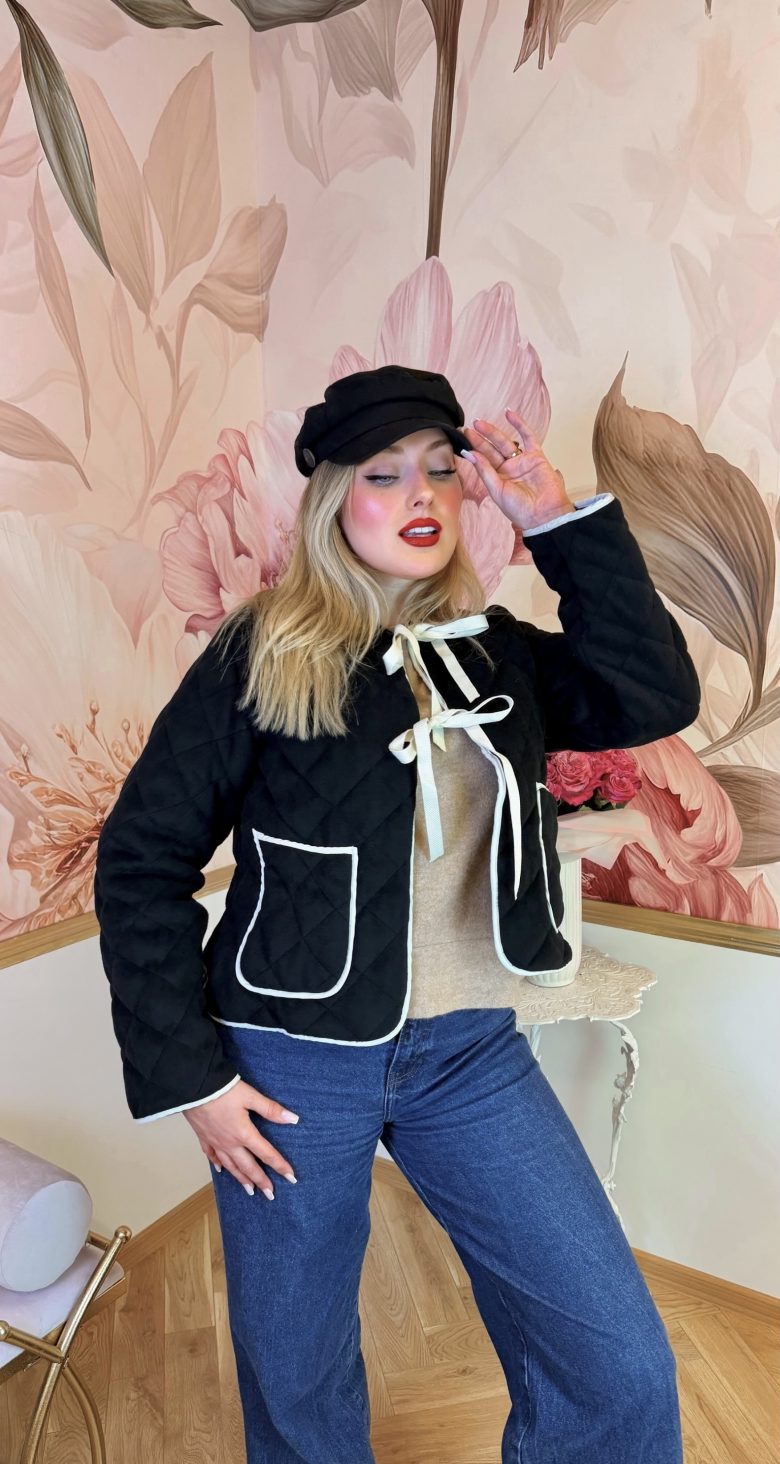 Prošívaná elegantní černá bunda s kontrastními lemy a vázáním, která má zajímavý detail a hezky oživí jednoduchý outfit. Ideální kousek na vrstvení. Bunda má kontrastní kapsy a zavazování na šňůrky. Je to teplejší kousek na jaro.