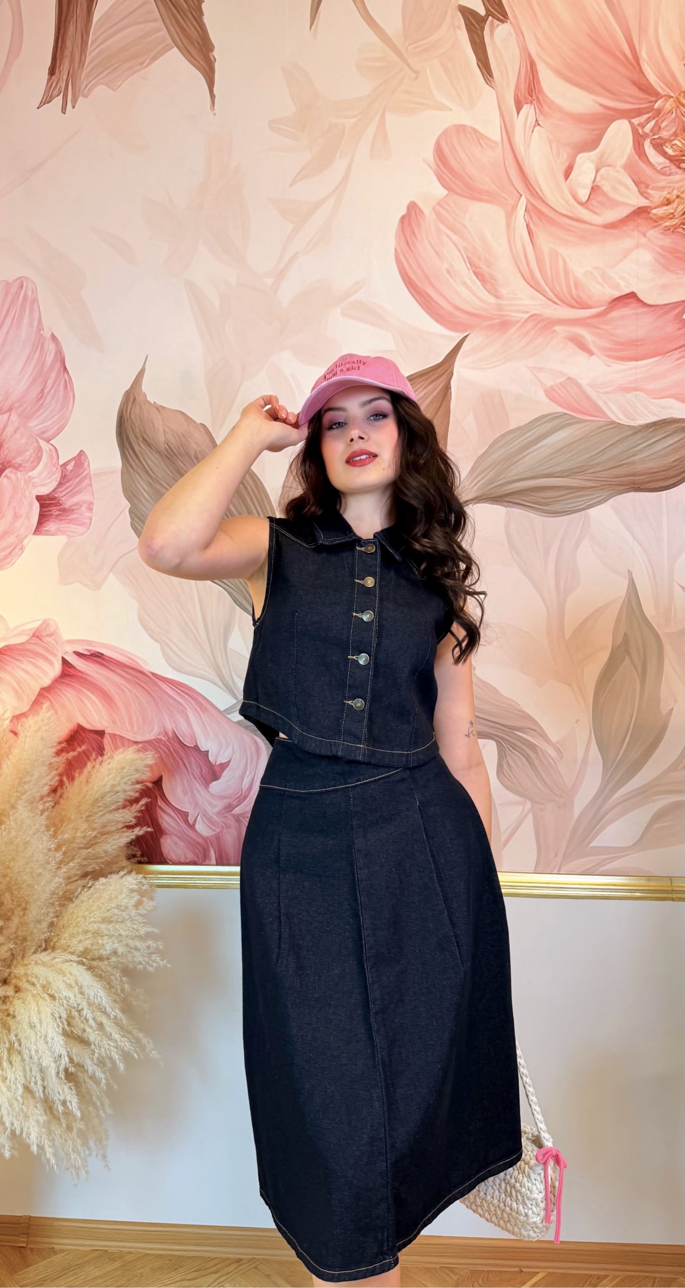 Stylový bavlněný kvalitní denimový set – halenka bez rukávů má zapínání na cvočky a áčková sukně v tmavém odstínu. Má kontrastní prošívání a pevnější materiál, takže drží tvar a vypadá fakt kvalitně a moderně.