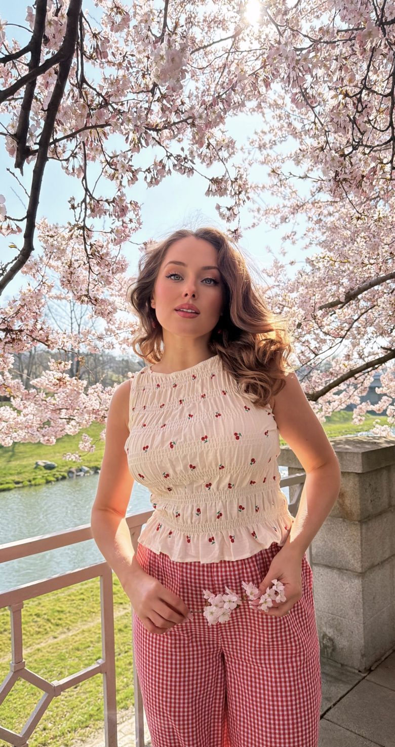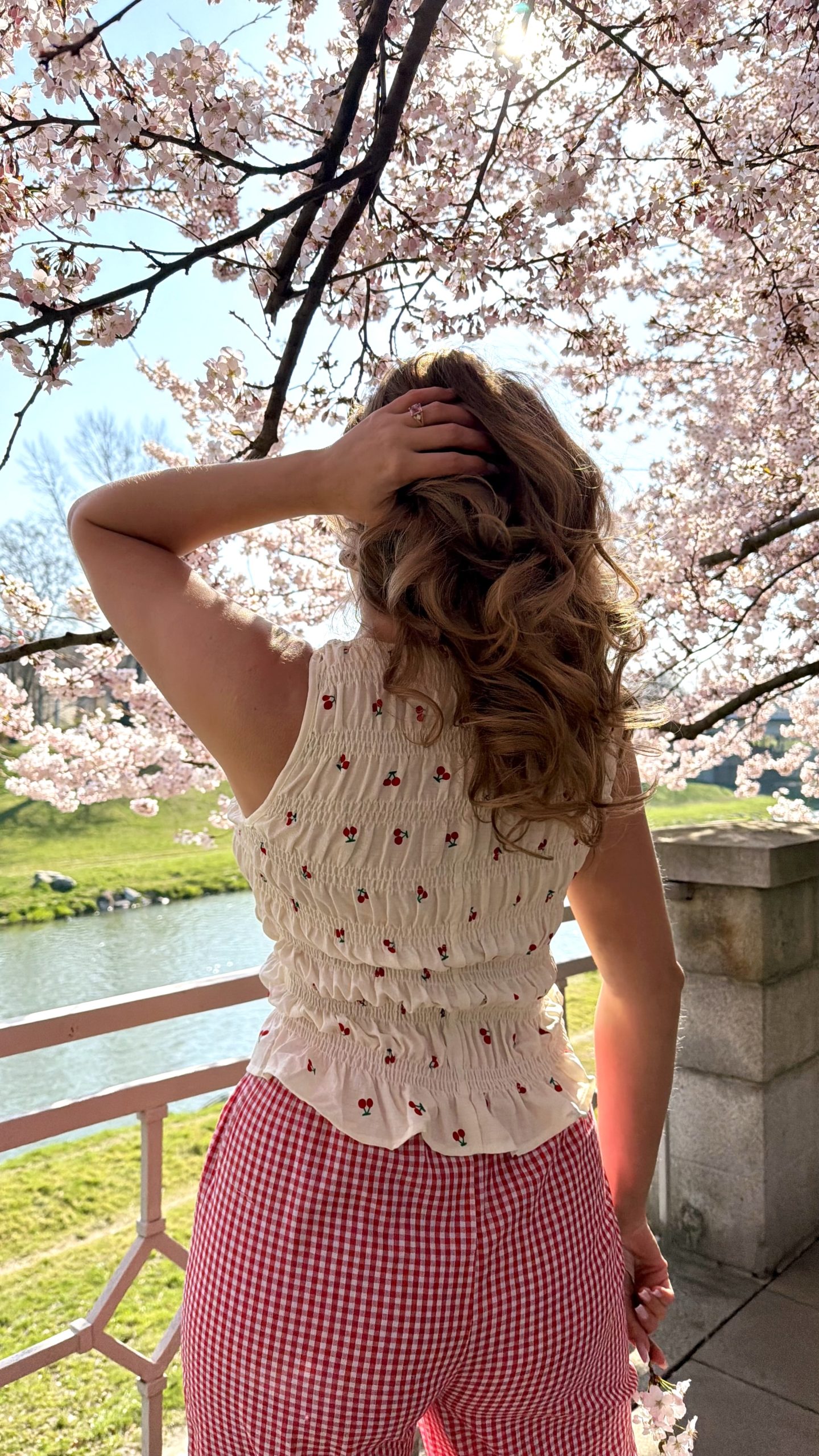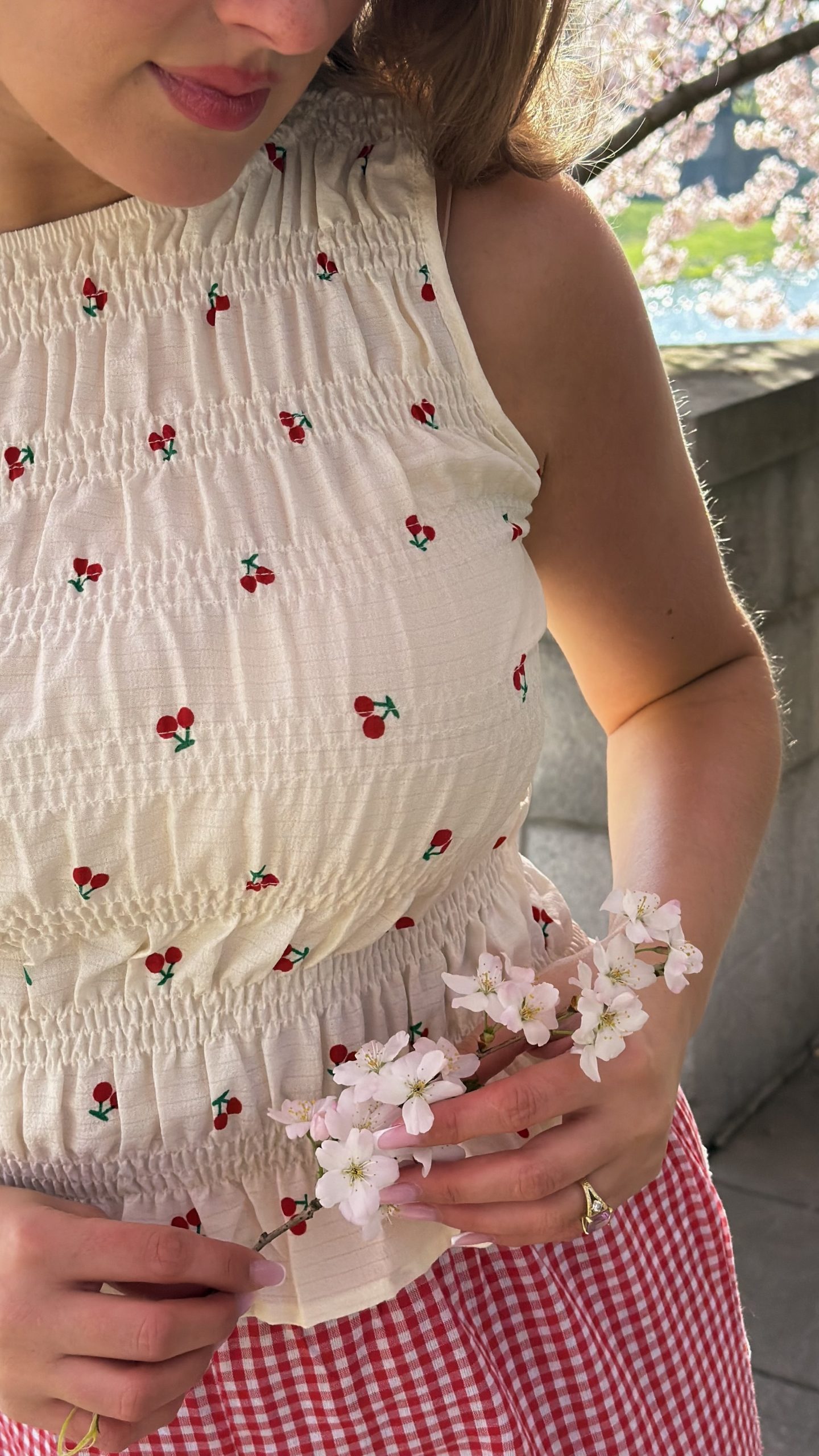 Třešničkový roztomilý top, po celé délce je žabičkování, takže se pěkně přizpůsobí postavě. Je pohodlný, neprůhledný, prodyšný a savý materiál.