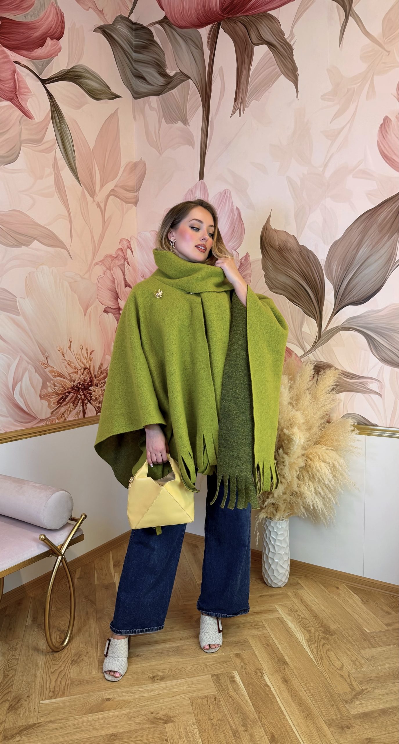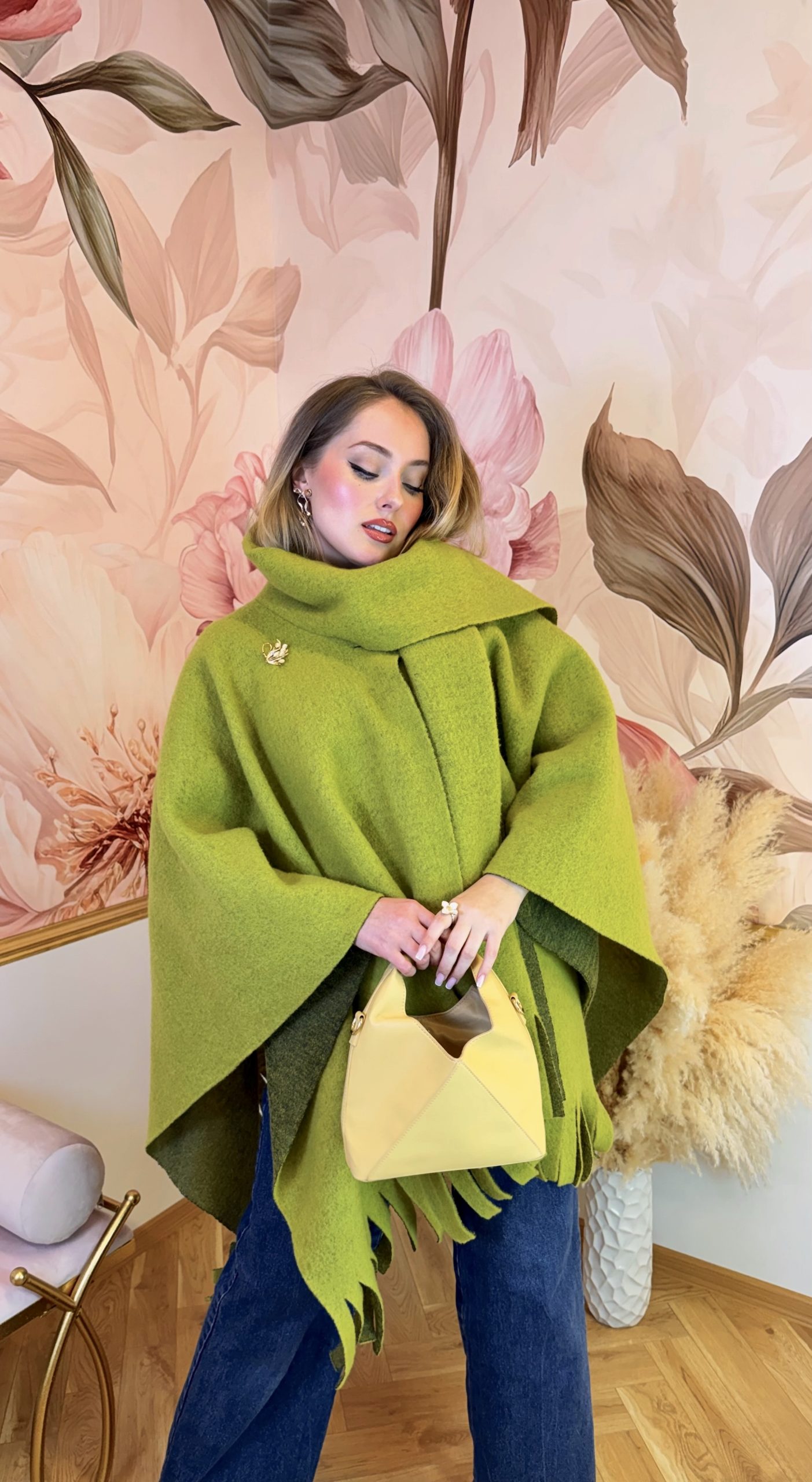 Výrazné vlněné zelené luxusní italské pončo s velkým límcem a ozdobným knoflíkem je přesně ten kousek, co oživí celý outfit a zároveň zahřeje. 70% vlna, jemné, heboučké na omak, naprosto unikátní kousek